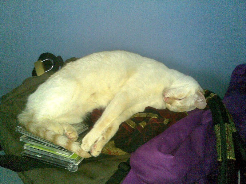 Das hier ist Merlin, der es sich auf meiner Tasche und meinen Cds bequem gemacht hat, 5 Minuten nachdem er selbige und mich zum ersten Mal sah